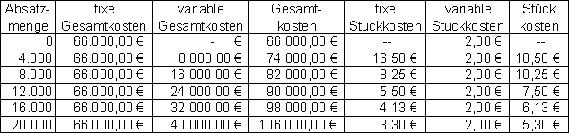 1 In einem Industriebetrieb, das nur ein Produkt fertigt und dies für 6,60 € verkauft, betragen die Fixkosten 66.000,00 €. Bei einer Produktionsmenge von 12.000 Stück wurden 90.000,00 € Gesamtkosten registriert.