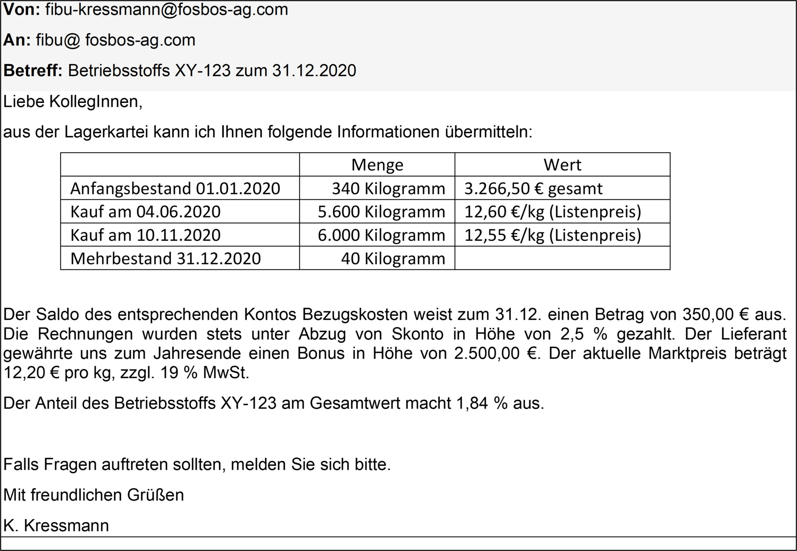 1.1 Ermitteln und begründen Sie den Bilanzansatz des Betriebsstoffs XY-123 am 31.12.2020.