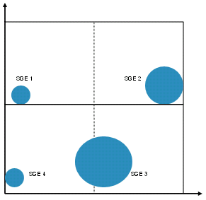Die strategischen Geschäftseinheiten werden innerhalb der 4-Felder-Portfolio-Matrix mit Hilfe von Kreisen dargestellt. Dabei vergrößern sich die jeweiligen Umfänge der Kreise mit steigenden Umsätzen der jeweiligen SGEs.