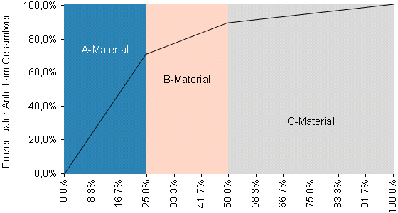 In den meisten Fällen liegt der Anteil der A-Materialien bei ungefähr 80 % des Gesamtwertes, die B-Material nehmen etwa 15 % und die C-Materialien circa 5 % des Wertes ein.