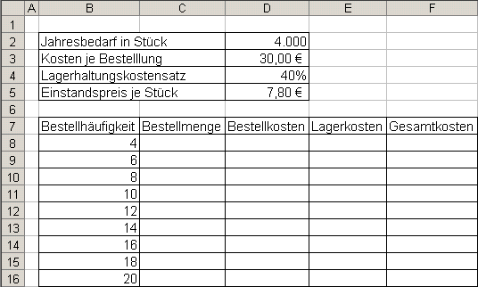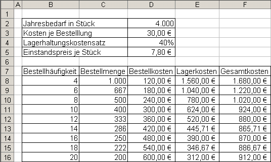 1 In einem Unternehmen besteht für einen Rohstoff ein Jahresbedarf von 4.000 Stück. Die Kosten je Bestellung betragen 30,00 €. Man kalkuliert mit einem Lagerhaltungskostensatz von 40 %. Der Einstandspreis je Stück beträgt 7,80 €.