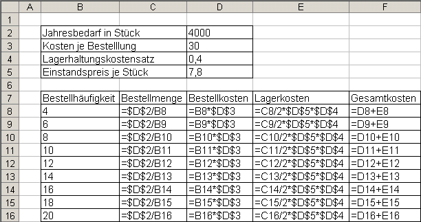Das Minimum der Gesamtkosten liegt in dieser Berechnung bei 7.494,00 €. Die optimale Bestellmenge beträgt 10.000 Stück. Die Bestellmenge wurde in Schritten zu 100 Stück berechnet. Es ist also nur ein näherungsweises Ergebnis. Mit Hilfe der ANDLER-Formel kann man die genaue Bestellmenge ermitteln: