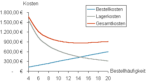 Die Gesamtkosten ergeben sich aus der Addition von Bestellkosten und Lagerkosten. Sie verlaufen parabelförmig. Das Minimum der Gesamtkosten liegt in der doppelten Höhe über dem Schnittpunkt von Lagerkosten und Bestellkosten. Je nach der Art der grafischen Darstellung erhält man entweder die optimale Bestellhäufigkeit auf der X-Achse oder die optimale Bestellmenge.