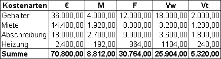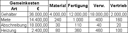 Die Gemeinkostensummen je Kostenstelle aus dem Betriebsabrechnungsbogen werden in das Kalkulationsschema übertragen.