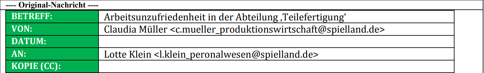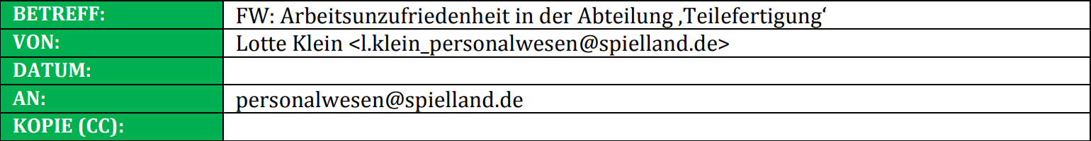 Aus diesem Grund bitte ich Sie um ein Gespräch, in welchem wir gemeinsam mit dem Abteilungsleiter der Teilefertigung, Herrn Platt, prüfen und überlegen, ob es Möglichkeiten gibt, die Arbeitsbedingungen zu verbessern und damit die Arbeitsunzufriedenheit abzubauen.