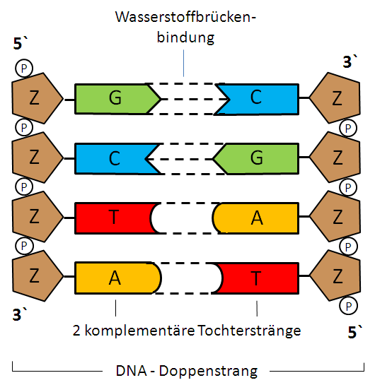 Aufgrund der vorgegebenen Basenpaarung ist durch die Struktur des einen Stranges automatisch die Struktur des zweiten Stranges festgelegt. Die beiden Stränge sind komplementär. Adenin paart immer mit Thymin (und umgekehrt), Cytosin immer mit Guanin (und umgekehrt). Die zueinander komplementären Basenpaare – Purin- und Pyrimidinbase – werden durch Wasserstoffbrückenbindungen zusammengehalten. Adenin und Thymin sind so über zwei, Cytosin und Guanin über drei Wasserstoffbrückenbindungen miteinander verbunden.