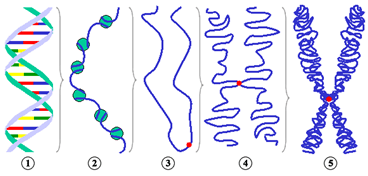 1  DNA-Doppelhelix, 2  10-nm-Fiber (DNA mit Nukleosomen), 3  Schematisierter Chromatinstrang während der Interphase vor der DNA-Verdopplung mit Centromer, 4  Kondensiertes Chromatin während der Prophase (nun aus zwei Chromatiden bestehend, weil sich die DNA verdoppelt hat), 5  Metaphasechromosom