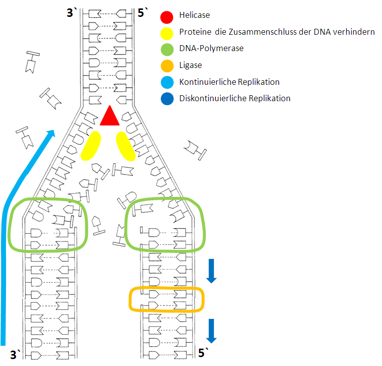 Bei Bakterien gibt es an einer Stelle des DNA-Ringes einen Startpunkt (Origin) für die Replikation. Bei Eukaryoten liegen pro Chromosom mehrere Origins vor. Die Doppelhelix wird dort durch das Enzym Helicase (ein spezielles Protein, hier als Dreieck dargestellt) entwunden und in die Einzelstränge aufgetrennt, d.h. die Basenpaarungen werden aufgehoben. Ein sofortiges Wiederverkleben der Einzelstränge wird durch bestimmte Proteine (single strand binding protein), die sich über die offenen Bindungsstellen legen, verhindert.