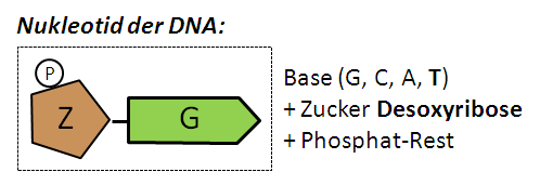 Als Nukleosid bezeichnet man eine Verbindung aus Zucker und einer der organischen Basen. Ein Nukleotid ergibt sich durch Verbindung eines Nukleosids mit einem Phosphatrest, stellt also eine Verbindung aus Zucker, einer der Basen und einem Phosphatrest dar. Insgesamt bestehen somit in der Regel vier verschiedene Nukleoside bzw. Nukleotide.