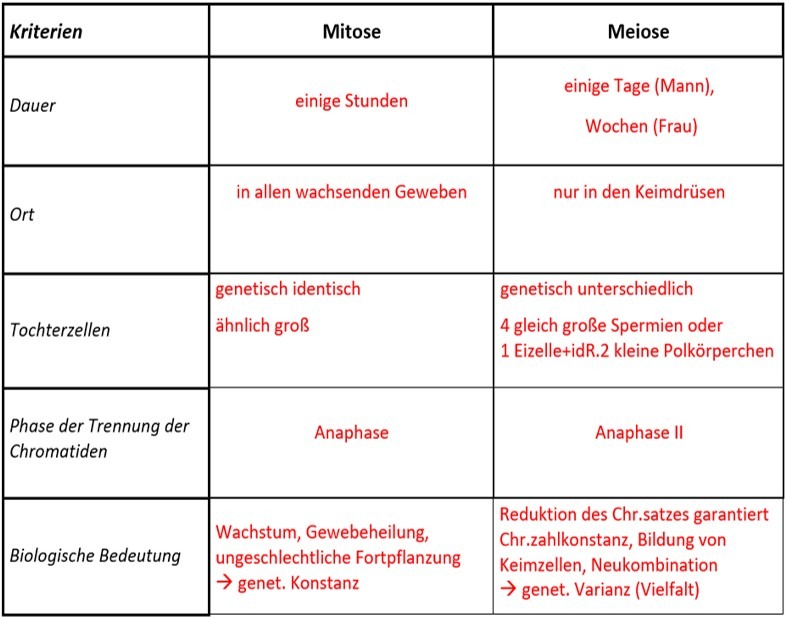 - Vergleichen Sie die beiden Kernteilungsvorgänge – Mitose und Meiose – hinsichtlich der folgenden Kriterien: Dauer, Ort, Tochterzellen, Phase der Trennung der Chromatiden, Biologische Bedeutung
