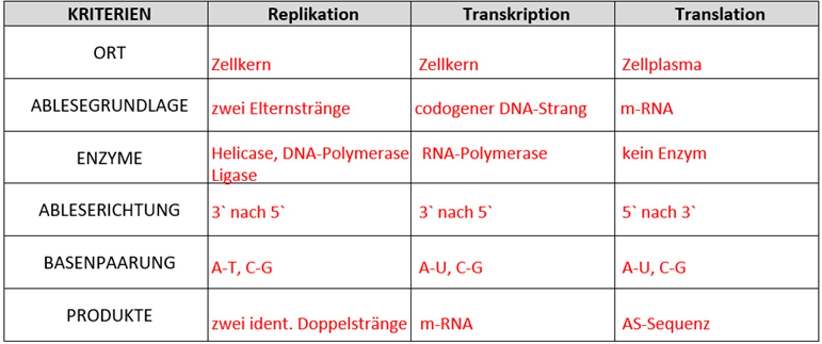 - Die DNA dient als Ablesegrundlage zum Ablauf verschiedener Stoffwechselvorgänge, welche die Voraussetzung zur Weitergabe von Erbinformation und zum Wachstum eines Organismus bilden. Definieren Sie die Begriffe Replikation, Transkription und Translation und vergleichen Sie diese hinsichtlich der folgenden Kriterien – Ort, Ablesegrundlage, Enzyme, Ableserichtung, Basenpaarung, Produkte.