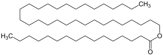 • besteht aus Myricin (Anteil ca. 65 Gew-%), einem Gemisch von Estern langkettiger Alkohole und Säuren, das von Palmitinsäuremyricylester dominiert wird, daneben freier Cerotinsäure, Melissinsäue und ähnlichen Säuren (12%), gesättigten Kohlenwasserstoffen (ca. 14 %), Alkoholen (ca. 1%) und anderen Stoffen (wie bienenartspezifischen Aromastoffen) (6%)