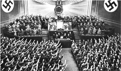 Am 22.03.1933 legte Hitler den Reichstagsabgeordneten ein „Gesetz zur Behebung der Not von Volk und Staat“ vor, das sog. „Ermächtigungsgesetz“. Jedoch hatte sich die Kulisse im Reichstag im Vergleich zum „Tag von Potsdam“ gänzlich gewandelt. Vor und im Gebäude waren SA-Verbände aufmarschiert. Auch Hitler erschien in Parteiuniform. Hermann Göring hatte alle Vorkehrungen getroffen, damit die erforderliche Zweidrittelmehrheit der Anwesenden und der Stimmen erreicht würde. Die 81 Abgeordneten der KPD, die zum Großteil inhaftiert waren, wurden erst gar nicht eingeladen, was nach der Weimarer Verfassung rechtswidrig war. 26 SPD-Abgeordnete waren bereits verhaftet oder geflohen. Verfassungswidrig war die zuvor mit Zustimmung der Abgeordneten verabschiedete Änderung der Geschäftsordnung des Reichstags, dass unentschuldigt fehlende oder ausgeschlossene Abgeordnete als anwesend gerechnet wurden.