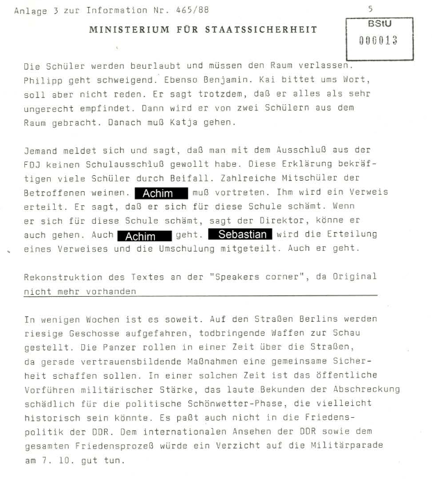3 Überlegen Sie, weshalb die Stasi über die Ereignisse an der Schule berichtet und nicht der Schulleiter, der Schulrat oder ein pädagogisches Gremium.