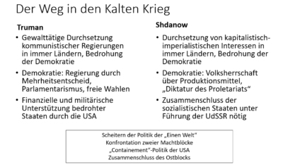 Sowohl die USA als auch die SU haben einen entscheidenden Anteil an der Blockbildung, dem Gegenüberstehen zweier grundverschiedener Gesellschaftssysteme, bestimmt von machtpolitischen und ideologischen Gegensätzen.