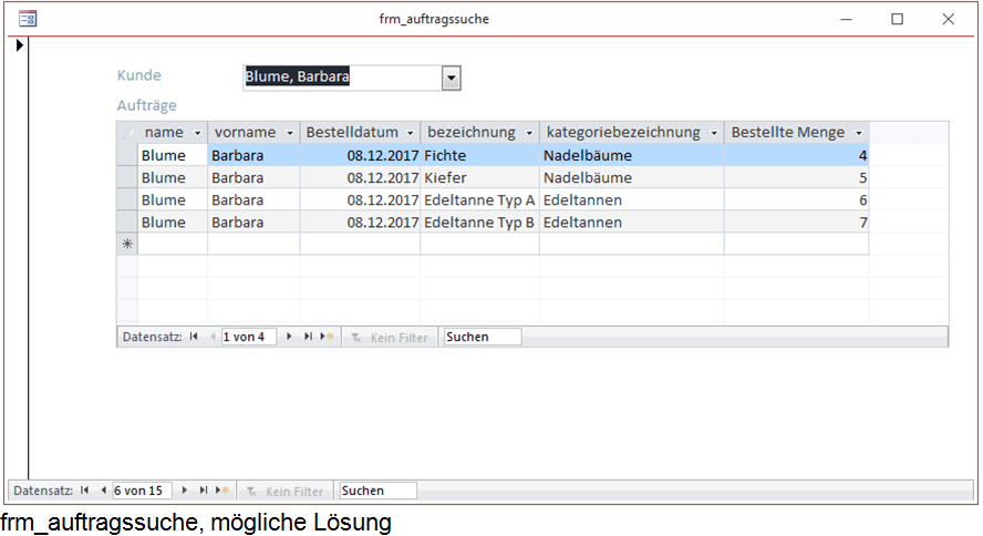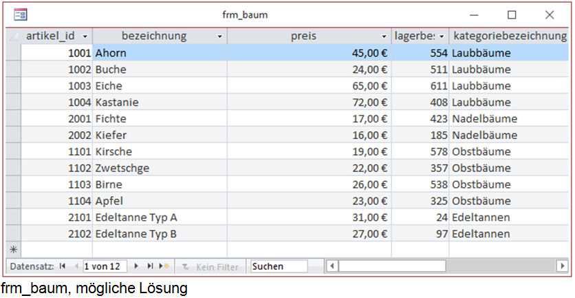 1 Erstellen Sie ein Formular, mit dem der Anwender auf die Datensätze der Bäume zugreifen kann. Achten Sie darauf, dass die Kategorie im Klartext angezeigt wird und das Formular auf eine Abfrage gebunden
