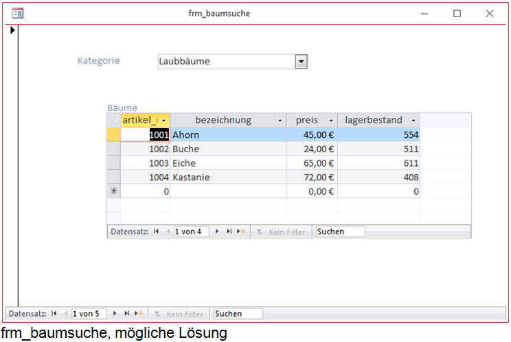 2 Erstellen Sie ein Formular, mit dessen Hilfe nach Eingabe der Kategorie in ein Kombinationsfeld sämtliche Bäume der ausgewählten Kategorie angezeigt werden.