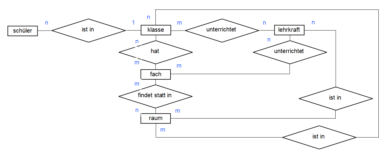 1 Nehmen Sie auch jetzt wieder Papier und Bleistift zur Hand. Lösen Sie alle n:m-Beziehungen des logischen ER-Modells „Schule“ auf. Zur Erinnerung sehen Sie das Modell hier noch einmal abgebildet: