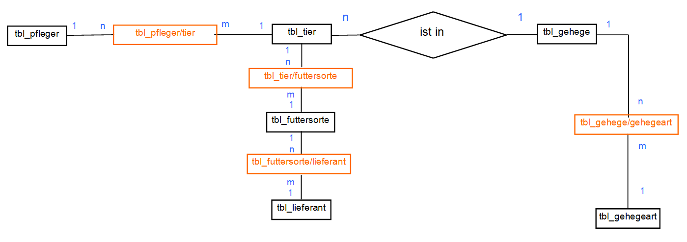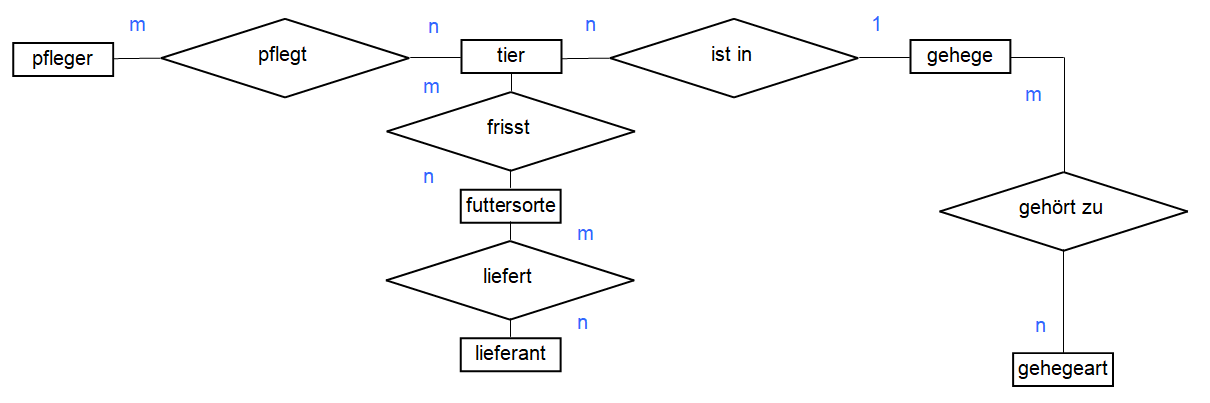 2 Nehmen Sie auch jetzt wieder Papier und Bleistift zur Hand. Lösen Sie alle n:m-Beziehungen des logischen ER-Modells „Tiergarten“ auf. Zur Erinnerung sehen Sie das Modell hier noch einmal abgebildet::