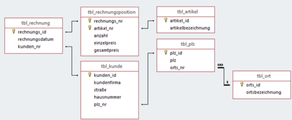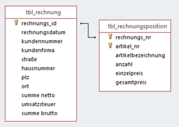 Für die Tabelle tbl_rechnungsposition sind die Rechnungsnummer und die Artikelnummer der zusammengesetzte Primärschlüssel (aus zwei Fremdschlüsseln). Sie werden mit rechnungs-Nr bzw. artikel-Nr bezeichnet.