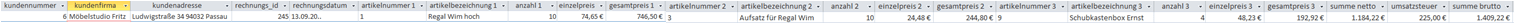 Datenansicht der Relation „tbl_rechnung“, welche sich nun in der ersten Normalform befindet
