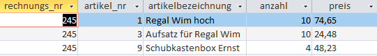 Die Rechnungsnummer wird als Primärschlüssel festgelegt und daher mit rechnungs-id bezeichnet. Bliebe es bei dieser einen Relation, würden viele Ziele der Datenorganisation nicht erreicht: