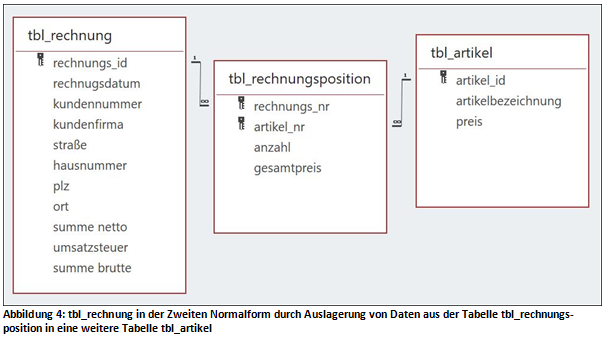 Die Tabelle tbl_rechnung befindet sich automatisch in der zweiten Normalform, weil sie sich in der ersten Normalform befindet und einen einfachen Primärschlüssel hat.