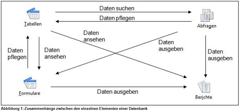 So können die Daten der Tabelle(n) über Abfragen und Formulare, z.B. zum Zweck der Datenpflege, geändert werden. Lesender Zugriff auf die Abfragen kann wiederum über Formulare und Berichte erfolgen. Die in Abfragen und Formularen abgelegten Informationen können durch Berichte ausgelesen werden.