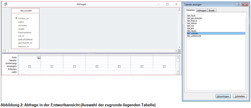 Wir gehen zu diesem Zweck in MS Access in die Registerkarte „Erstellen“ und wählen in dieser Umgebung „Abfrageentwurf“. Sodann öffnet sich ein Dialogfeld, in welchem wir die Elemente auswählen können, welche der Abfrage zugrunde gelegt werden sollen. Wir wollen uns mit unserer ersten Abfrage alle unsere Schüler mit ID, Name und Vorname anzeigen lassen und wählen daher die Tabelle „tbl_schüler“ aus: