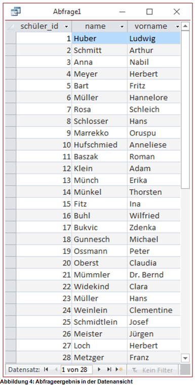 Klicken wir jetzt im Reiter „Start“ auf „Ansicht“, können wir uns das Ergebnis unserer ersten Abfrage in der Datenansicht ansehen: