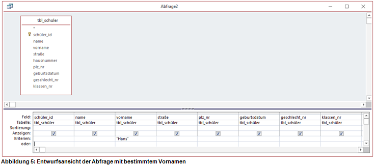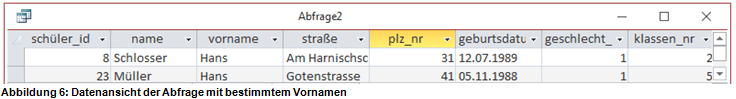 In einer weiteren Abfrage wollen wir uns die Datensätze aller Schüler anzeigen lassen, welche den Vornamen Hans haben. Es sollen alle Attribute der Datensätze angezeigt werden.