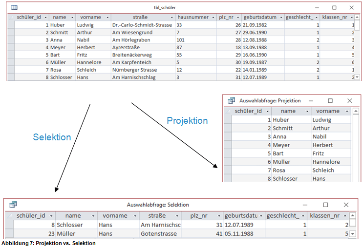 Halten wir fest: Eine Selektion besteht grundsätzlich aus den drei Anweisungen SELECT, FROM sowie WHERE, während der Projektion die letzte Anweisung fehlt.