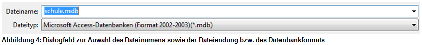 An dieser Stelle ist es wichtig, dass wir – neben dem Speicherort für die neue Datenbank – für die spätere Programmierarbeit das Datenbankformat „%.mdb“ wählen, wobei % für einen frei wählbaren Dateinamen steht: