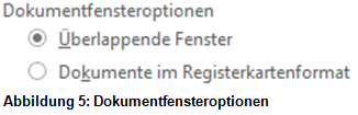 Eine Änderung an der Ansicht der neuen Datenbank nehmen wir noch vor, bevor wir mit der eigentlichen Arbeit beginnen: Zu diesem Zweck klicken wir auf Datei|Optionen|Aktuelle Datenbank. In der sich öffnenden Umgebung wählen wir „Überlappende Fenster“: