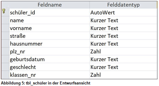 Die Tabelle tbl_schüler sieht in der Entwurfsansicht nun folgendermaßen aus: