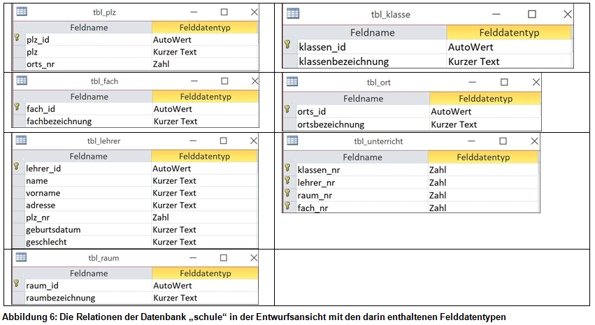 Nachdem wir jetzt gemeinsam die erste Tabelle unserer Schuldatenbank erstellt haben, versuchen Sie bitte, die übrigen Tabellen in der kennengelernten Vorgehensweise zu erstellen. Die Lösungen können Sie sich nach getaner Arbeit in der nächsten Abbildung ansehen:
