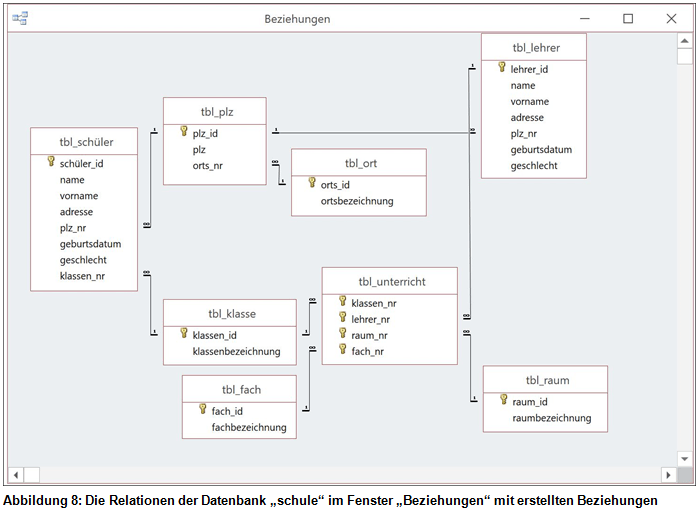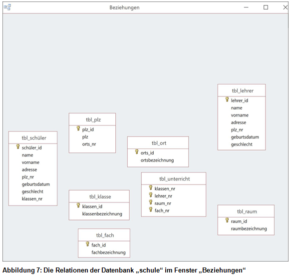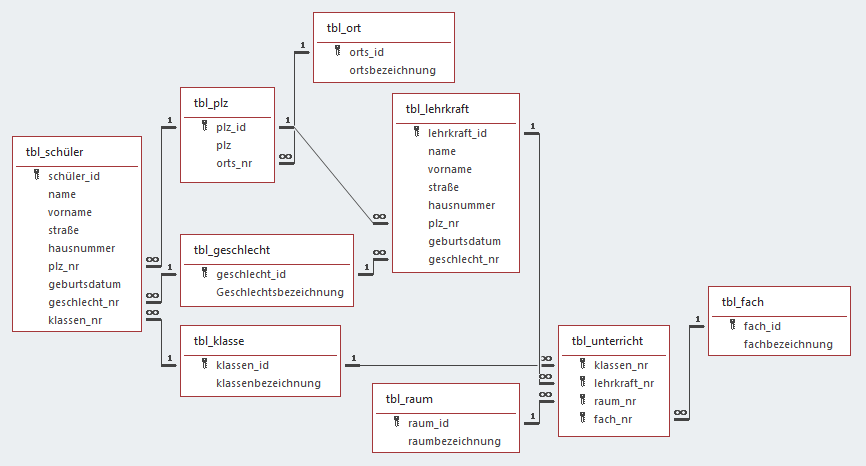 Zur Erinnerung führen wir uns das fertige relationale DB-Modell „Schule“ noch einmal vor Augen: