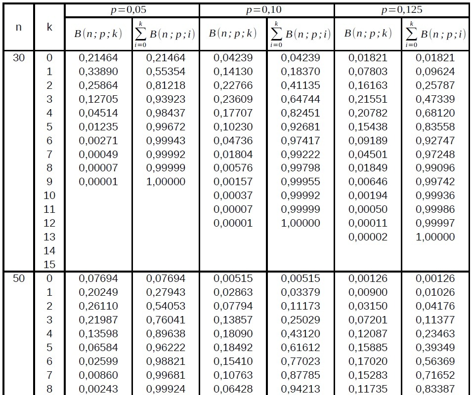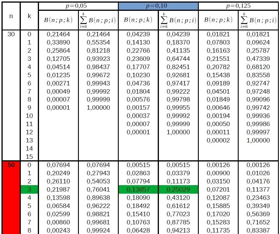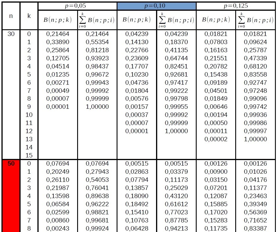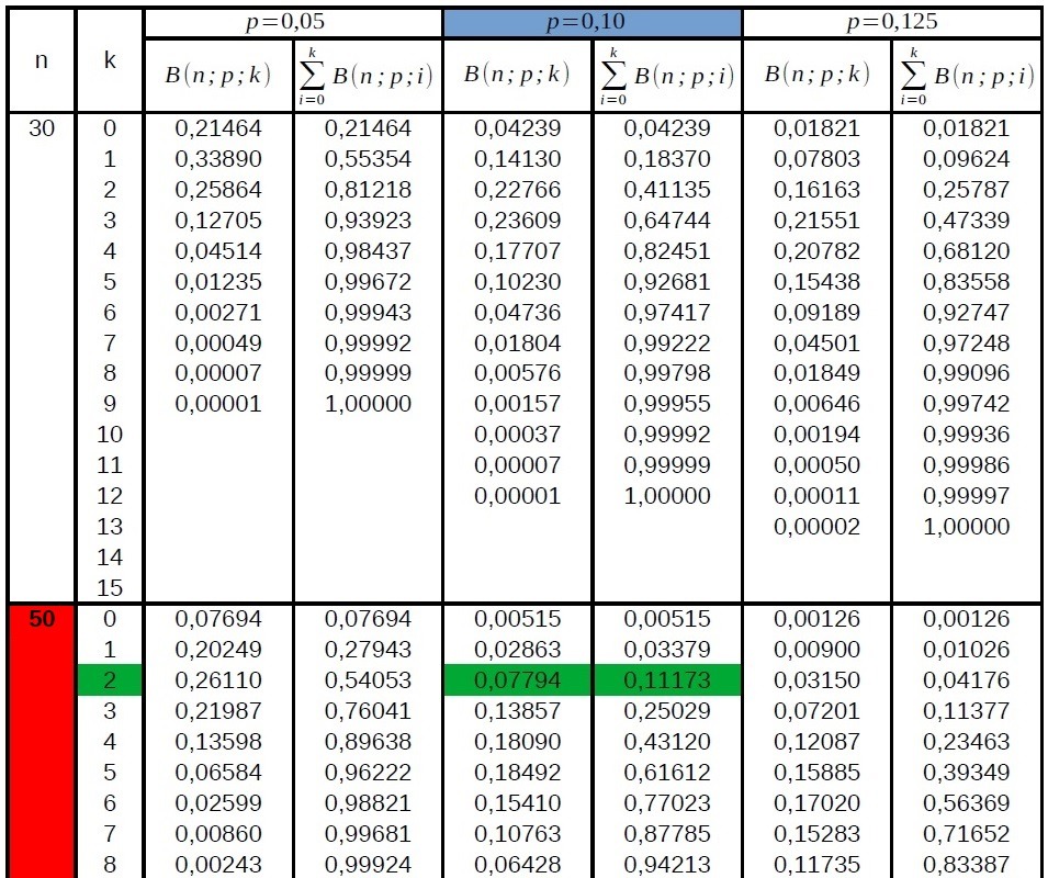 In Tafelwerken zur Stochastik sind Wahrscheinlichkeiten in Bernoulli-Ketten für ausgewählte Trefferwahrscheinlichkeiten \(p\) aufgelistet: