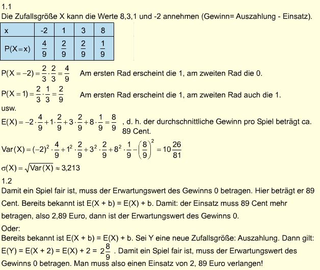 Der Einsatz beträgt 2 Euro. Berechnen Sie Erwartungswert, Varianz und Standardabweichung der Zufallsgröße \(X\): Gewinn. |