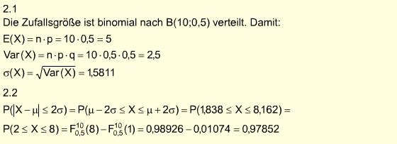 Berechnen Sie die Wahrscheinlichkeit, dass die Anzahl von Kopf um höchstens das Doppelte der Standardabweichung vom Erwartungswert abweicht. |