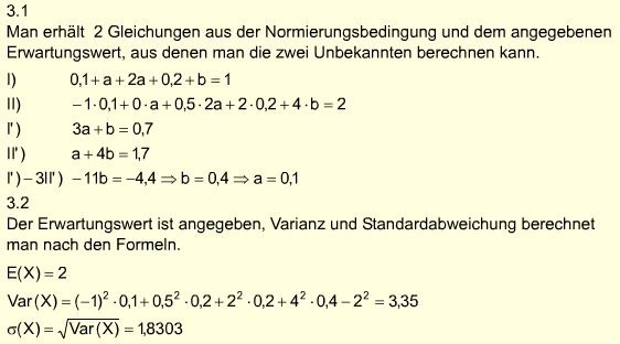 \[\begin{array} {c|c} x & -1 & 0 & 0,5 & 2 & 4 \\ \hline P(X = x) & 0,1 & a & 2a & 0,2 & b \end{array}\]Weiter ist bekannt, dass der Erwartungswert \(µ = 2\) ist. |
