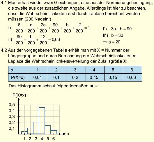 Bei der Untersuchung von Kiefernadeln wird die Länge \(L\) von 200 zufällig ausgewählten Nadeln bestimmt und in sechs Längengruppen eingeteilt. Die Zufallsgröße \(X\) gibt die Nummer der jeweiligen Längengruppe an. Dabei ergibt sich folgende Verteilung mit \(a, b \in \mathbb{N}\).\[\begin{array} {c|c} L \: in \: mm & L \leq 40 & 40 < L \leq 44 & 44 < L \leq 48 & 48 < L \leq 52 & 52 < L \leq 56 & L > 56 \\ \hline Längengruppe & 1 & 2 & 3 & 4 & 5 & 6 \\ \hline Anzahl & 8 & a & 2a & 90 & b & 12 \end{array}\]Die Wahrscheinlichkeit, dass eine zufällig ausgewählte Nadel in einer der Längengruppen 4 bis 6 liegt, beträgt dabei 0,66. |
