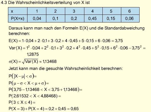 Bestimmen Sie, mit welcher Wahrscheinlichkeit die Zufallswerte innerhalb der einfachen Standardabweichung um den Erwartungswert liegen. |