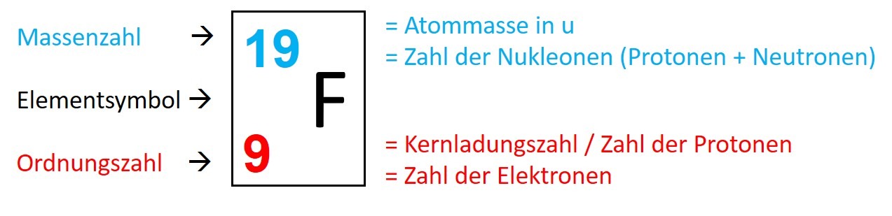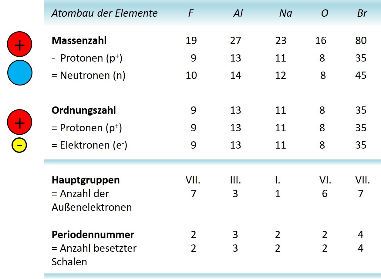 Mit Hilfe der individuellen Stellung der Elemente im Periodensystem, ist es möglich die Anzahl der Elementarteilchen im Atomkern und in der Atomhülle für jedes Element zu bestimmen. Zusätzlich können Aussagen für die Aufenthaltsbereiche der Elektronen in der Atomhülle getroffen werden. Für die Elemente Fluor, Aluminium, Natrium, Sauerstoff und Brom ist dies in der Tabelle erfasst.