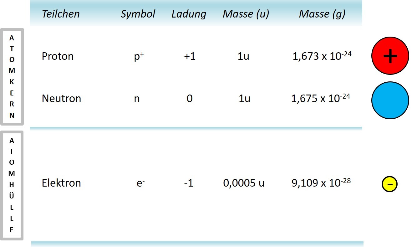 Die Elementarteilchen unterscheiden sich in Ladung und Gewicht. Protonen sind positiv geladen (p+) und Neutronen (n) sind ungeladen, beide besitzen jeweils die Masse von 1 u. Sie machen 99,9 % der gesamten Atommasse aus. (Erläuterung siehe unten) Hingegen sind die Elektronen (e-) negativ geladen und mit einem Gewicht von 0,0005 u fast masselos sind.