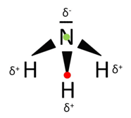 Beim Ammoniakmolekül beträgt die Elektronegativitätsdifferenz für jede N-H-Bindung 0,9. Es liegen also polare Atombindungen vor. Entscheidend ist wieder die Frage des räumlichen Baus. Der Bindungswinkel von 107,5° führt dazu, dass die H-Atome in der “unteren” Molekülhälfte zu finden sind. Es gibt also auch hier eine schwach negative und eine schwach positive Molekülseite, bzw. die beiden Partialladungsschwerpunkte fallen nicht in einem Punkt zusammen. Während der negative im N-Atom liegt, fällt der positive in die Mitte des Dreiecks, das die H-Atome bilden. Ammoniak besteht also wie Wasser und Chlorwasserstoff aus Dipolmolekülen.