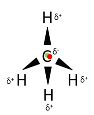 Die Verhältnisse im Methan unterscheiden sich insofern, als hier nur sehr schwach polare Atombindungen auftreten (Elektronegativitätsdifferenz von 0,4). Der tetraedrische Bau führt dazu, dass im Molekül keine Polarität auftritt. Positive und negative Partialladungen gleichen sich völlig aus. Die beiden Partialladungsschwerpunkte fallen beide im C-Atom zusammen. Methan ist daher kein Dipolmolekül.