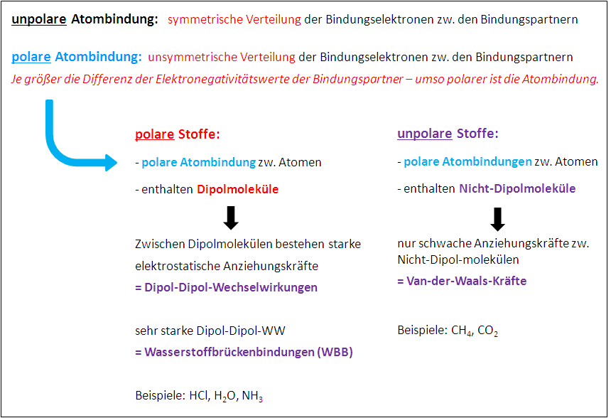Während zwischen unpolaren Molekülen nur sehr schwache Anziehungskräfte wirken, die sog. Van-der-Waals-Kräfte, treten zwischen polaren Molekülen stärkere elektrostatische Kräfte auf, sog. Dipol-Dipol-Wechselwirkungen.