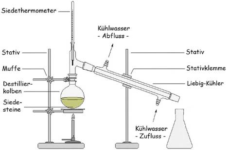 Bei der Destillation nutz man den Effekt der temperaturabhängigen Aggregatzustandsänderung, die für jeden Stoff spezifisch ist. Durch Destillation können die Rotweinbestandteile Ethanol (Siedetemperatur 78 ºC) und Wasser (Siedetemperatur 100 ºC) voneinander getrennte werden.