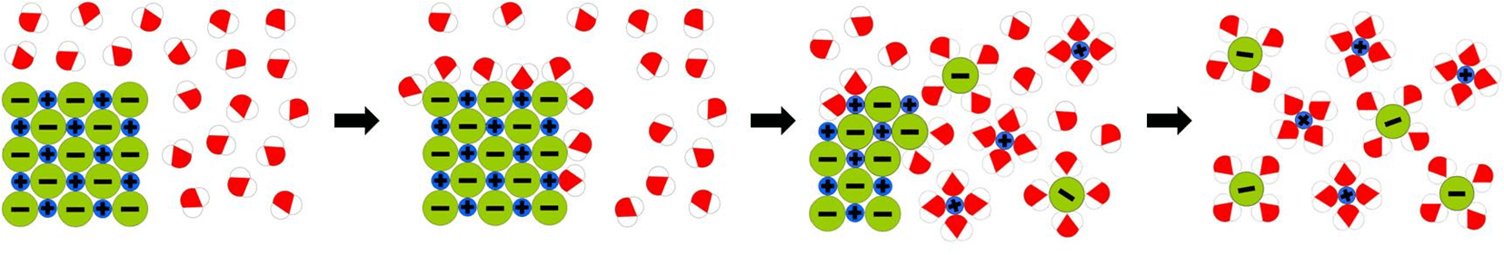 Wasser-Moleküle lagern sich mit ihrem positiven Ladungsschwerpunkt an die Anionen und mit ihrem negativen Ladungsschwerpunkt an die Kationen des Ionengitters an. Sie lösen die Ionenbindung und überwinden damit die Gitterenergie. Die Einzelionen werden aus dem Ionengitter gelöst und vollständig von Wasser-Molekülen umhüllt (= Hydrathülle).